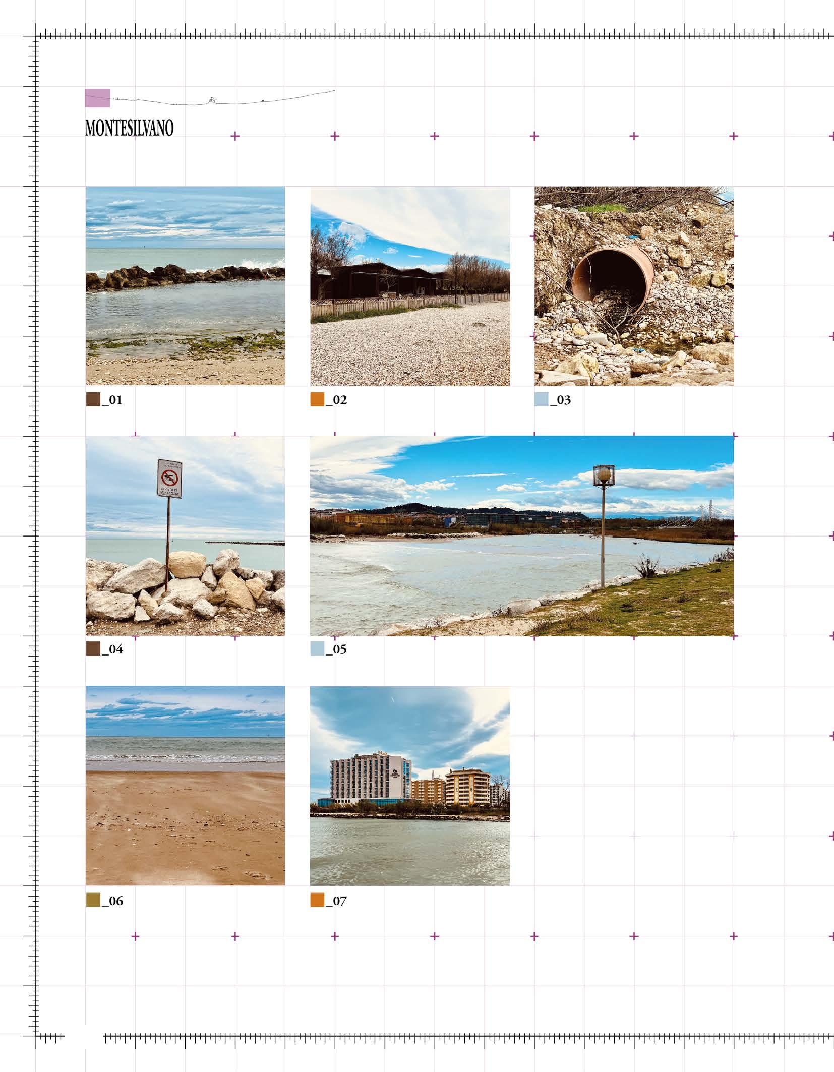 Analysing the coast from north to south, starting from Montesilvano and continuing along the waterfronts of Pescara and Francavilla al Mare, the six identified themes allow us to show a particularly fragile and unstable coast, where natural problems overlap with those of anthropic origin. The changes/adaptations primarily concern the beach resorts, which, depending on the needs, provide for the circumscription of their spaces. The sea of umbrellas disappears, giving way to a new landscape made of artificial dunes and large blocks of concrete deposited on the ground for protection. This informal and spontaneous phenomenon of space modelling between land and sea is intended to guarantee protection from