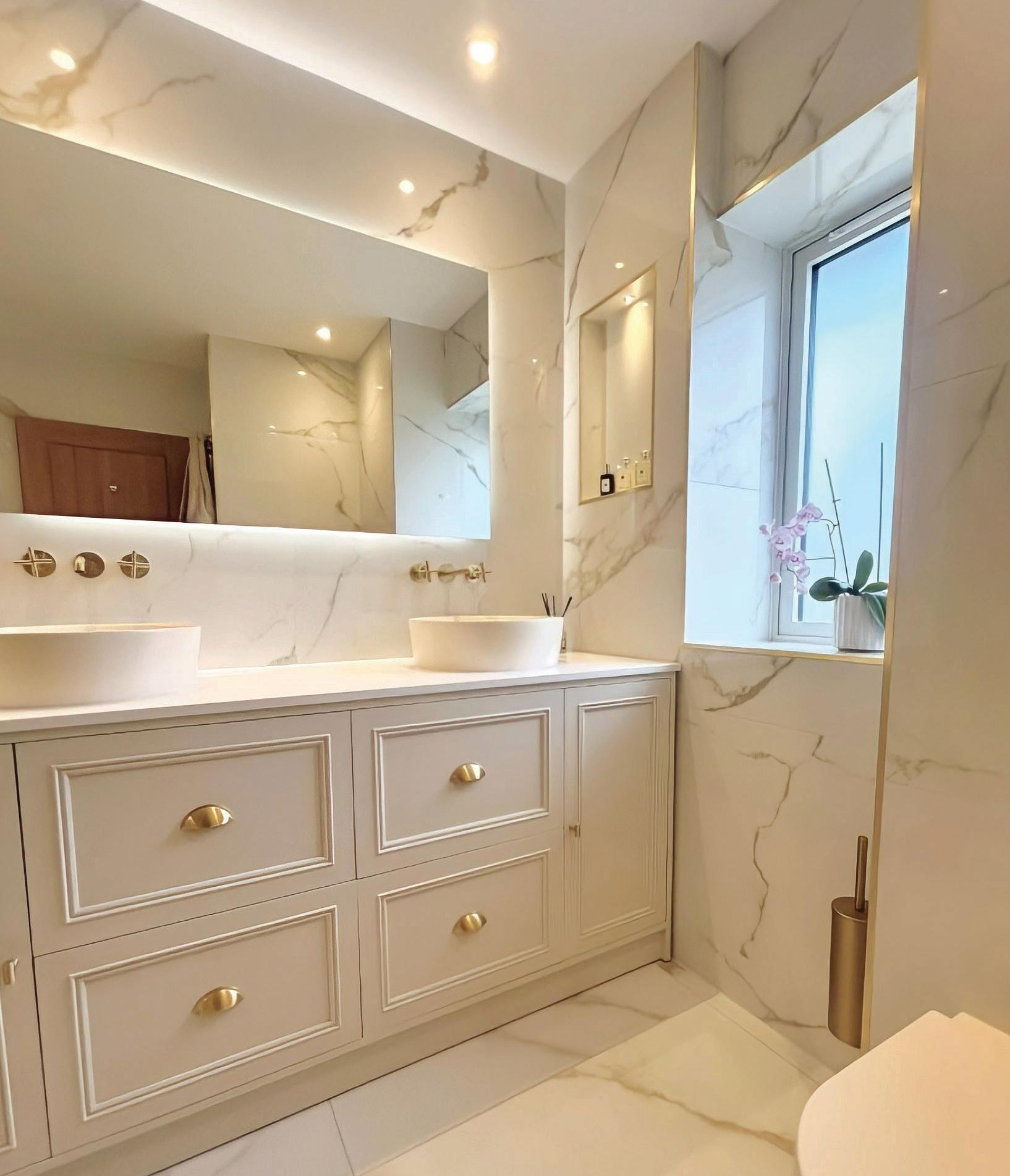 In recent years we are seeing an upturn in requests for something a little different. Clients don’t always know exactly what they want, but they want something that is more exciting than what they previously had. It is the job of our qualified, trained and experienced bathrooms designers to guide clients towards something that fits the brief but that will also stand the test of time. Making cloakrooms, ensuite and bathrooms more exciting is a challenge we love to take on! We have many ways to add interest to even the smallest of spaces. Options for interest can range from ambient lighting, coloured brassware and patterned tiles to boxing out sections for alcoves and building partition walls.
