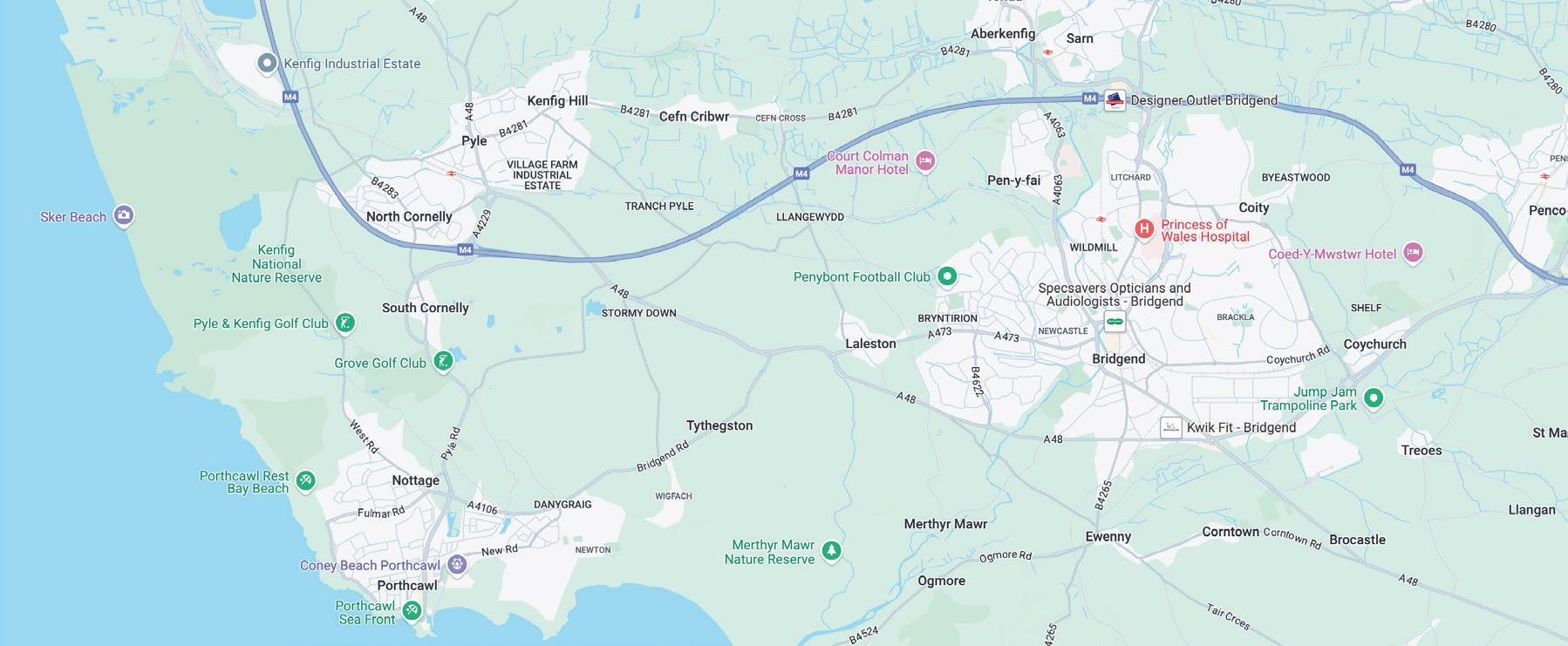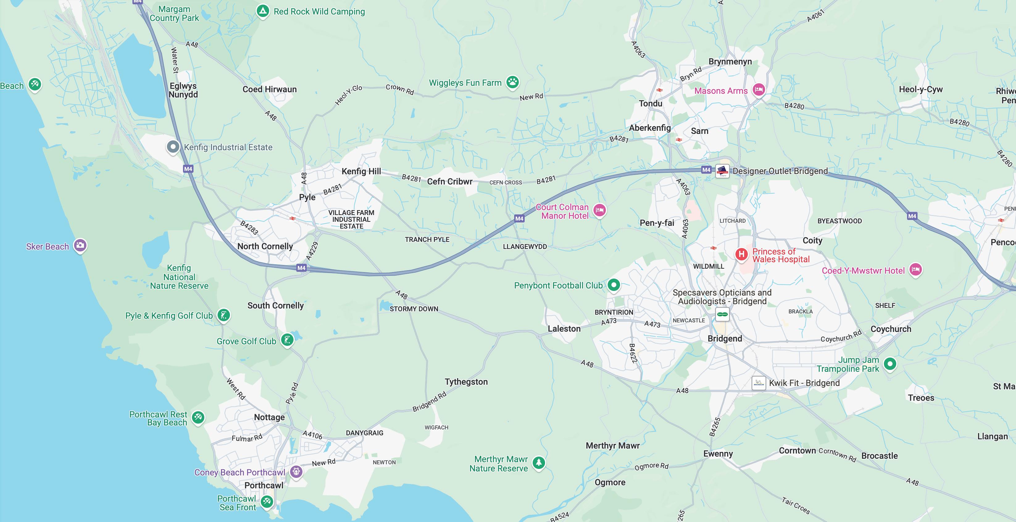 Porthcawl, Stormy Down, South Cornelly, North Cornelly, Kenfig, Maudlam, Pyle, Kenfig Hill, Cefn Cribwr, Penyfai, Laleston and Margam Village. And now to: Broadlands (Bridgend), Stormy Down & Eglwys Nunydd.