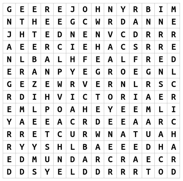 Find names of 16 Kings and Queens of England: RICHARD - ELIZABETH - VICTORIA - STEPHEN - HENRY - ALFRED - EDWARDCHARLES - GEORGE - JANE GREY - JOHN - ETHELRED - MARY - MAUDEDMUND - ANNE