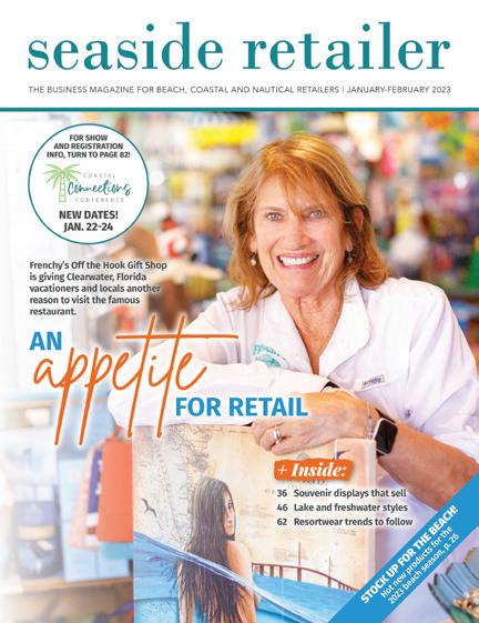 THE BUSINESS MAGAZINE FOR BEACH, COASTAL AND NAUTICAL RETAILERS | JANUARY-FEBRUARY 2023 seaside retai ler BEACH | COASTAL | NAUTICAL STOCKUPFORTHEBEACH! Hotnewproductsforthe 2023beachseason,p.26 FOR SHOW AND REGISTRATION INFO, TURN TO PAGE 82! NEW DATES! JAN. 22-24 COASTAL Connections CONFERENCE + Inside: 36 Souvenir displays that sell 46 Lake and freshwater styles 62 Resortwear trends to follow Frenchy’s Off the Hook Gift Shop is giving Clearwater, Florida vacationers and locals another reason to visit the famous restaurant. appetiteFOR RETAIL AN