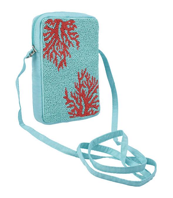 The vibrant Coral Club bag makes a great fashion accessory for ocean lovers and has a convenient pocket on the backside to carry a phone.