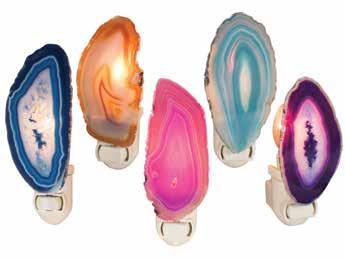 The gift for any season! Agate Night Lights from Silver Streak are made using 3-inch Agate Slices that are mounted on UL approved night light assemblies with a built-in On/Off switch and a 4 watt bulb. Sold in packs of 12 assorted colors, including blue, pink, natural, purple, red, and tea. FREE Display with your first purchase of 72-plus Agate Night Lights!