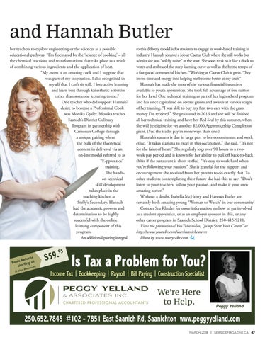 and Hannah Butler her teachers to explore engineering or the sciences as a possible educational pathway. “I’m fascinated by the ‘science of cooking’ – all the chemical reactions and transformations that take place as a result of combining various ingredients and the application of heat. “My mom is an amazing cook and I suppose that was part of my inspiration. I also recognized in myself that I can’t sit still. I love active learning and learn best through kinesthetic activities rather than someone lecturing to me.” One teacher who did support Hannah’s desire to become a Professional Cook was Monika Gysler. Monika teaches Saanich’s District Culinary Program in partnership with Camosun College through a unique pairing where the bulk of the theoretical content in delivered via an on-line model referred to as “E-pprentice” training. The handson technical skill development takes place in the teaching kitchen at Stelly’s Secondary. Hannah had the academic prowess and determination to be highly successful with the online learning component of this program. An additional pairing integral on parati e r p x nal ta perso ry