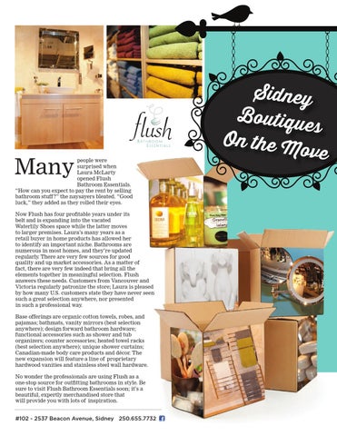 people were surprised when Laura McLarty opened Flush Bathroom Essentials. “How can you expect to pay the rent by selling bathroom stuff ?” the naysayers bleated. “Good luck,” they added as they rolled their eyes. Now Flush has four profitable years under its belt and is expanding into the vacated Waterlily Shoes space while the latter moves to larger premises. Laura’s many years as a retail buyer in home products has allowed her to identify an important niche. Bathrooms are numerous in most homes, and they’re updated regularly. There are very few sources for good quality and up market accessories. As a matter of fact, there are very few indeed that bring all the elements together in meaningful selection. Flush answers these needs. Customers from Vancouver and Victoria regularly patronize the store; Laura is pleased by how many U.S. customers state they have never seen such a great selection anywhere, nor presented in such a professional way. Base offerings are organic cotton towels, robes, and pajamas; bathmats, vanity mirrors (best selection anywhere); design forward bathroom hardware; functional accessories such as shower and tub organizers; counter accessories; heated towel racks (best selection anywhere); unique shower curtains; Canadian-made body care products and décor. The new expansion will feature a line of proprietary hardwood vanities and stainless steel wall hardware. No wonder the professionals are using Flush as a one-stop source for outfitting bathrooms in style. Be sure to visit Flush Bathroom Essentials soon; it’s a beautiful, expertly merchandised store that will provide you with lots of inspiration.