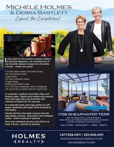 n the spirit of this month’s culinary edition of Seaside Magazine, I’ve included one of my favourite dessert recipes for chocolate mousse. I hope you enjoy! 5 to 6oz semi-sweet chocolate chips 1/4 cup boiling water 3 egg yolks 1/4 cup Amaretto liquor 3 egg whites 2 tbsp granulated sugar 1 to 1-1/4 cup whipping cream (whipped) 1/4 cup finely crushed walnuts (optional) In a blender, combine chocolate chips and boiling water. Blend until melted and smooth, then add egg yolks and Amaretto and continue to blend for 30 seconds. In a separate bowl, beat egg whites to soft peaks, gradually add sugar while beating to stiff peaks. Gently fold the chocolate mixture into the egg whites mixture, then fold in the whipped cream. Fold in walnuts if desired. Pour into individual service and chill for at least 4 hours. Garnish as desired.