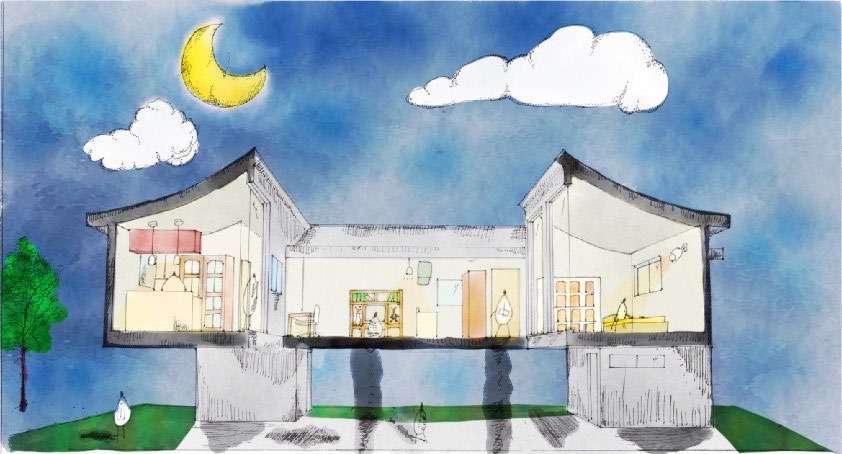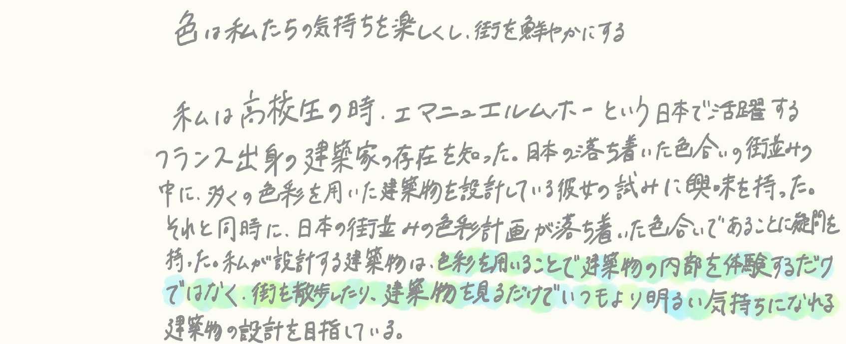 Mioと 海音 み お イタリア語でMioには、「私の」という意味がある。常に設計において、自分らしさが表現された 「『私の』建築」を追求していきたい。そんな思いを込めて、タイトルを「Mio」にした。また、表紙 のデザインは、五線譜と波で私の名前を表現した。海の波のように自由に設計を行い続けたい。そんな 思いも込めた。 1つでも多く設計していきたい。これからも、人々の営みを少しでも豊かにし、利用者と共に完成する建築を建築は利用者がいて初めて完成するものである。 住吉の長屋 CG模型
