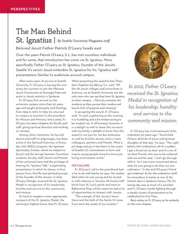 After many years of service at Seattle University, Fr. O’Leary is leaving the university this summer to join the Manresa Jesuit Community at Gonzaga Prep and assist in Jesuit ministry in Spokane. Fr. O’Leary first arrived on the university campus more than 50 years ago and taught philosophy and theology from 1964 to 1970. In 1993, he returned to campus as assistant to the president for Mission and Ministry. Since 2002, Fr. O’Leary has been chaplain for faculty and staff, giving spiritual direction and working on retreats. Among other ministries, he has led alumni and staff on pilgrimages, has been active in the Spiritual Exercises in Everyday Life (SEEL) program, the Ignatian Spirituality Center, which he helped to found, and the Arrupe Seminar. Countless students, faculty, staff, alumni and friends of the university have had the privilege of hearing his “Ignatius Talk,” a captivating presentation in which he shares, in firstperson form, the life and spiritual journey of the founder of the Jesuits. In 2012, O’Leary fittingly received the St. Ignatius Medal in recognition of his leadership, humility and service to the community and mission. It’s hard to imagine a more appropriate recipient of the St. Ignatius Medal, the university’s highest honor, than Fr. O’Leary.