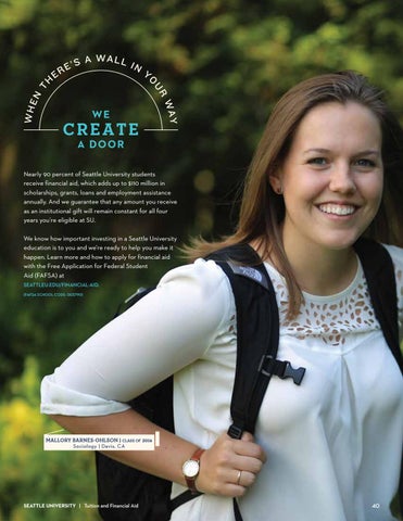 Nearly 90 percent of Seattle University students receive financial aid, which adds up to $110 million in scholarships, grants, loans and employment assistance annually. And we guarantee that any amount you receive as an institutional gift will remain constant for all four years you’re eligible at SU. We know how important investing in a Seattle University education is to you and we’re ready to help you make it happen. Learn more and how to apply for financial aid with the Free Application for Federal Student Aid (FAFSA) at SEATTLEU.EDU/FINANCIAL-AID. (FAFSA SCHOOL CODE: 003790)
