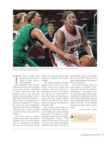 action-packed season as they square off with five WCC teams and five teams that participated in last season’s NCAA Tournament. The women will play most of its home games at Connolly Center, where they will host the Seattle U Thanksgiving Tournament Nov. 26–27, and some games at KeyArena. In addition to doubleheaders with the men’s team throughout the season, the women will host the Seattle U Holiday Classic from Dec. 29–30, featuring Gonzaga and Notre Dame, among others. —Diana Chamorro, ’11 MSAL
