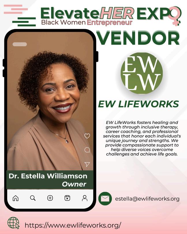In response to numerous requests for culturally inclusive clinical and career development services, Dr. Estella Williamson founded EW LifeWorks in 2025. Estella has over 25 years of experience in clinical practice, social work education, and human services leadership. She also has 20+ years of experience serving as a licensed notary public. Dr. Williamson's clinical expertise includes the treatment of mental health and personality disorders, relational and sexuality issues, and phase of life issues related to aging, grief and loss, and employment. She also brings years of experience in organizational assessment, program management, and evaluation