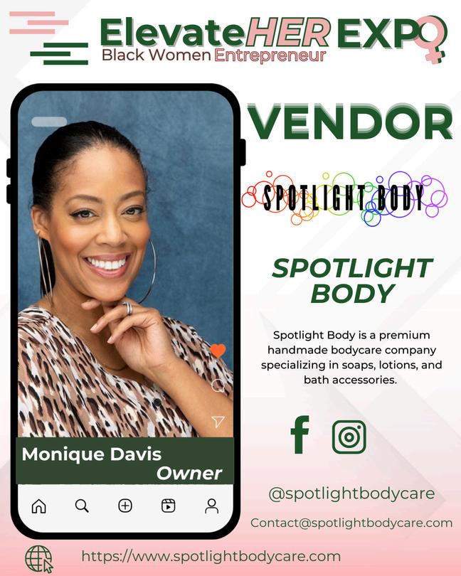 Monique Davis is the founder and creative force behind Spotlight Body, an affordable premium body care brand redefining self-care with bold, long-lasting fragrances and highquality ingredients Inspired by her own need for a moment of escape as a busy wife and mother, Monique created Spotlight Body as a modern-day “Calgon” for a new generation offering sensory experiences that transform everyday routines into indulgent “me time.”