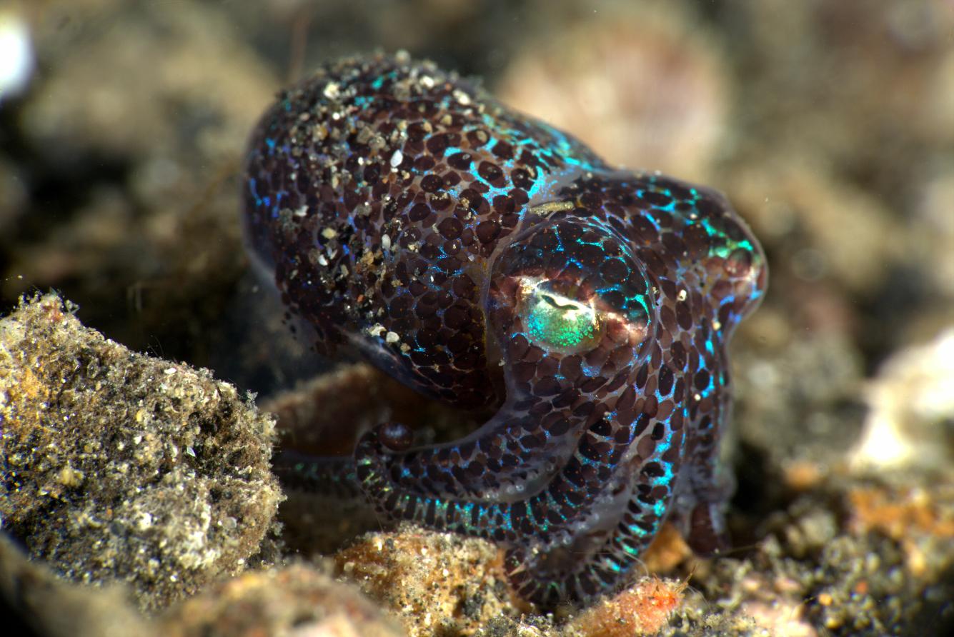 The tiny cephalopod,E berryi, shows us how to utilize light to our advantage! The bobtail squid has a symbiotic relationship with bioluminescent bacteria that allows it to avoid making shadows caused by the moon and stars,helping them to better avoid predators They posses a specialized light organ to house the bacteria,but some glitter and sequins will work just as well to capture their enchanting glow