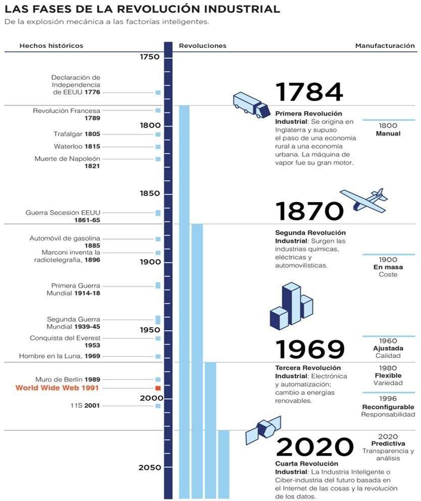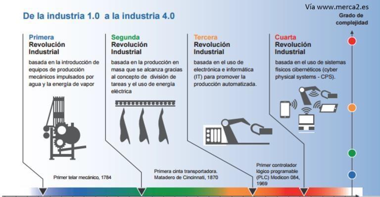 Este concepto de Industria 4.0 expresa la idea de que el mundo se encuentra en los prolegómenos de lo que podría llamarse Cuarta Revolución Industrial (o sea, en una fecha próxima a un hito importante en el desarrollo industrial, que justifique decir que se ha iniciado una nueva fase o una nueva etapa). Después del desarrollo de la máquina de vapor y de la mecanización (segunda mitad del siglo XVIII), después del desarrollo de la electricidad con fines domésticos e industriales (fin del siglo XIX), y después de la automatización (siglo XX), la nueva etapa (cuarta etapa) de la transformación industrial muy posiblemente estará sustentada en la llamada fábrica inteligente, caracterizada por la interconexión de máquinas y de sistemas en el propio emplazamiento de producción, y caracterizada por un fluido intercambio de información con el exterior (con el nivel de oferta y demanda de los mercados, y/o con los clientes, y/o los competidores, y/o con otras fábricas inteligentes, etc) [3].