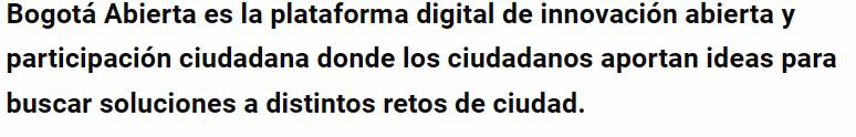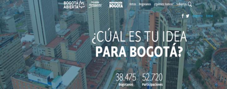 Bogotá Abierta hace parte de una estrategia permanente en el tiempo de participación e innovación ciudadana del Gobierno Distrital, liderada por Participación Bogotá –IDPAC- (Instituto Distrital para la Participación y Acción Comunal), donde los retos y los problemas de la ciudad se convierten en oportunidades de transformación positiva que los ciudadanos impulsan con sus ideas, aportes y contenidos.