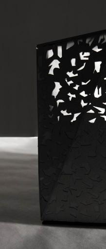 The unique pattern on the exterior is a result of digital manipulation of the texture on a Richard Serra sculpture. These shapes allow diffused light to perforate the performance space to enhance the experience of the show.