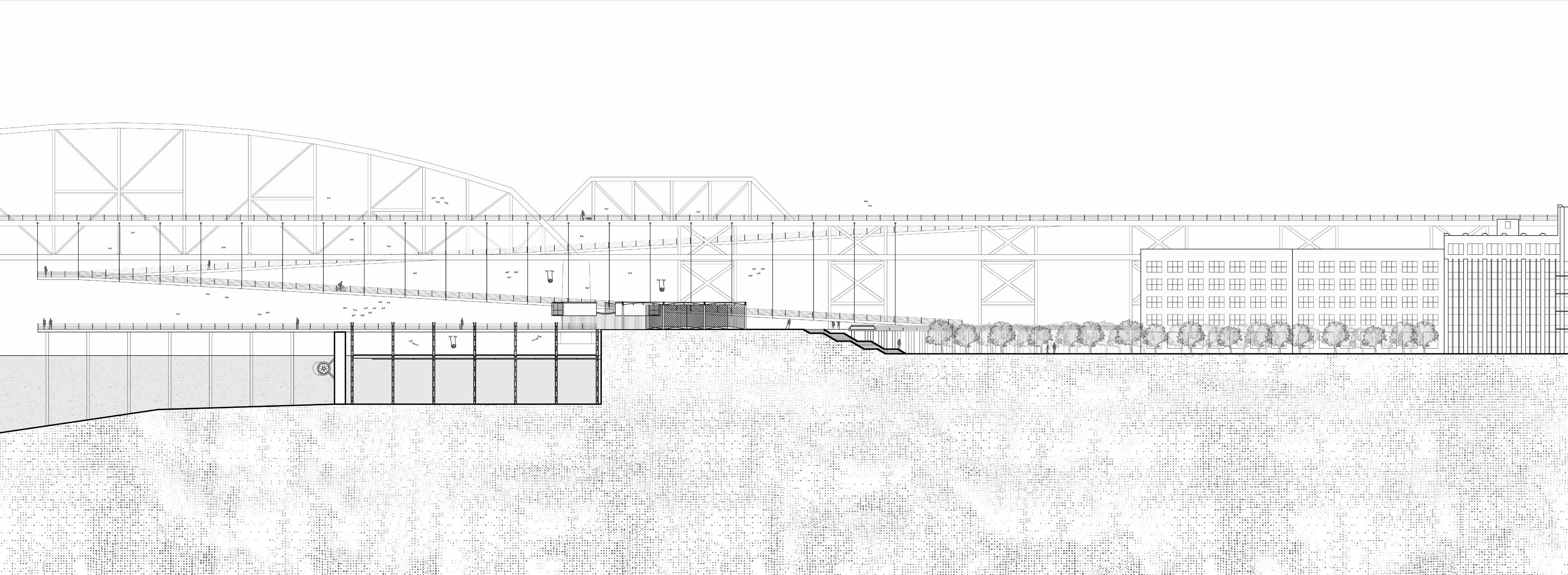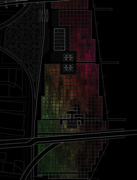 The research facility bridges the proposed Chouteau’s greenway and Gateway Arch National Park. Within the research center, a park attracts visitors to the site. The park overlooks the algae culture field and offers piers that stretch over the Mississippi River as well as public pools set amongst the algae tanks. At night, the park provides a vivid light show of illuminated algae tanks for spectators.
