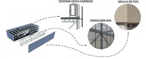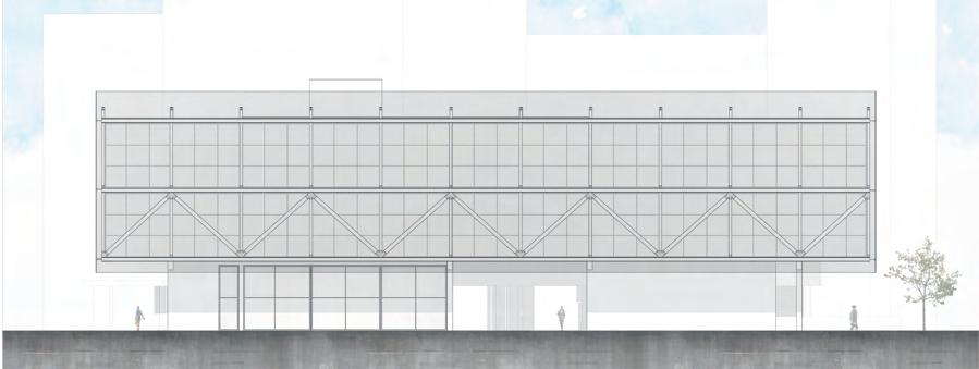 La escuela dentro de la manzana es el volumen de mayor jerarquía y expresa su lenguaje a través de su estructura de celosías de perfiles de acero Doble T expuestas, con una malla de PVC traslucida, a su alrededor.