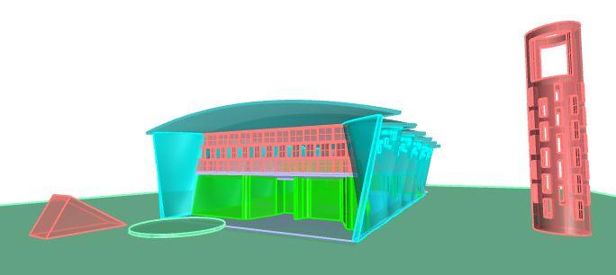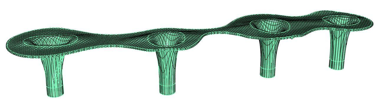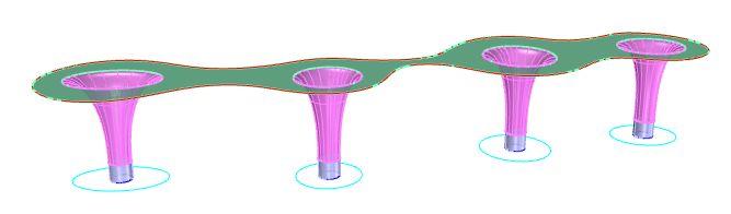 ● Con los contornos generamos extrusiones sólidas para generar la totalidad de los parasoles y les añadimos bases con unos cilindros