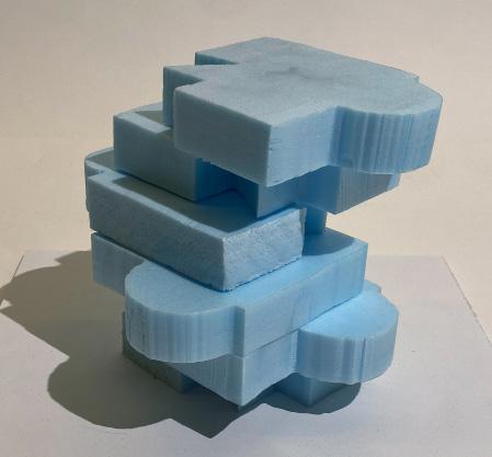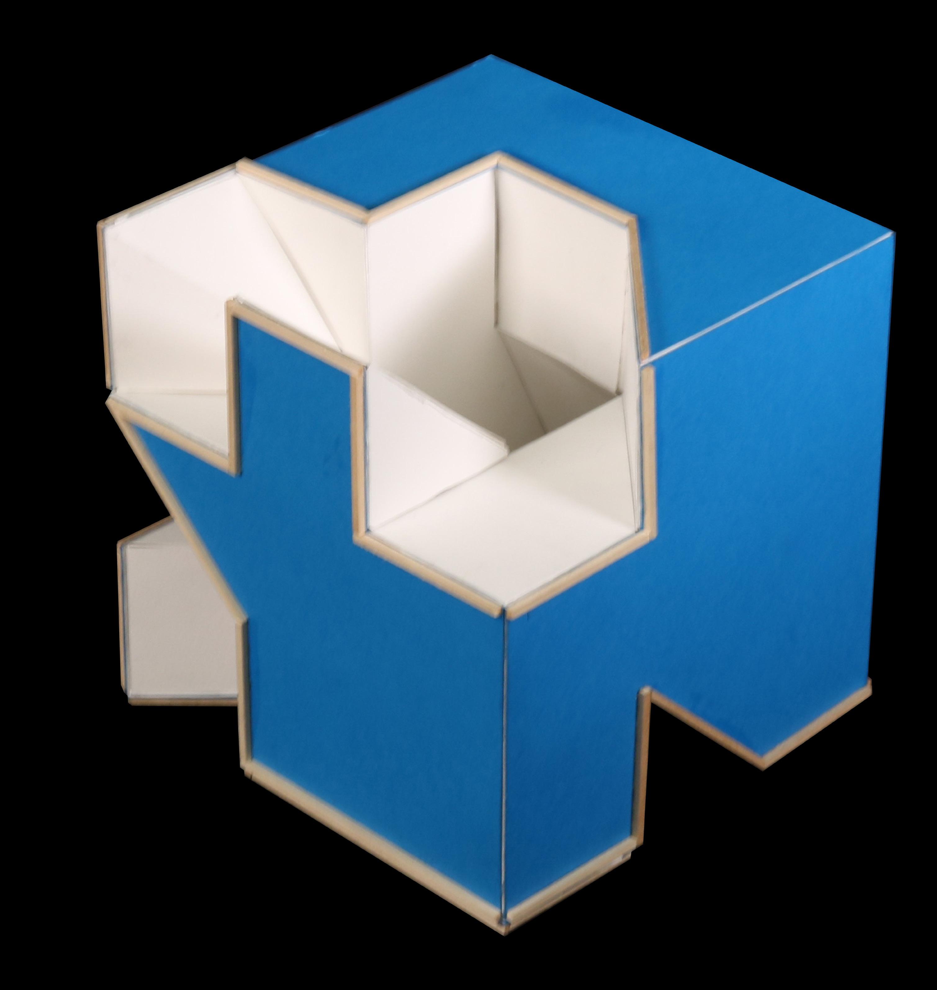 The original layout of the cube prior to filling the voids. Next to the layout is an Axonometric drawing of the cube and its dominant voids.