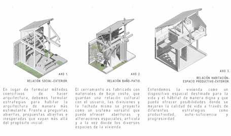 Por lo tanto, entendemos la vivienda como un dispositivo espacial destinado para la vida y el hábitat de manera digna y que pueda ofrecer posibilidades donde se mejoren la calidad de vida a través de diferentes estrategias como productividad, auto-suficiencia y progresividad.
