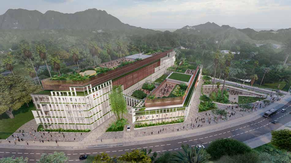 Paisaje y Sostenibilidad: Un profundo interés por crear espacios dignos y apropiados para la educación nos invitó a proponer los patios, y las circulaciones abiertas como las primeras estrategias bioclimáticas que gobernarían la implantación racional de las torres, recibiendo el sol por medio de muros macizos y permitiendo una adecuada circulación cruzada de aire entre sus celosías.