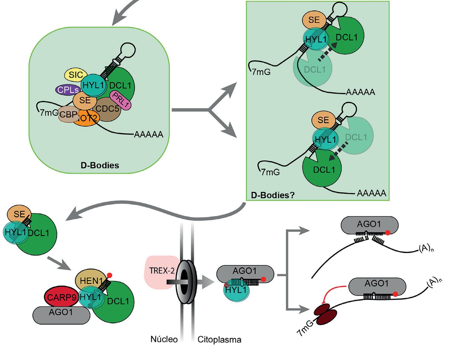 El procesamiento de los pri-miARNs no es un mecanismo rígido ni universal, sino que depende de características intrínsecas de cada pri-miARN, como su estructura secundaria, modificaciones químicas, o su asociación con proteínas accesorias. Este ajuste fino permite a la célula regular, de forma específica, qué miARNs se producen en cada tipo celular o en respuesta a señales externas concretas. De hecho, aunque el procesamiento acoplado a la transcripción ofrece muchas ventajas como un menor consumo energético y una mayor eficiencia, muchos miARNs no se procesan de esta manera. En esos casos, una vez transcritos, muchos pri-miARNs se dirigen a estructuras subnucleares especializadas denominadas «Dicing bodies» o «D-bodies». En ellos se concentran componentes del microprocesador, como DCL1, HYL1 y SE, responsables de llevar a cabo el corte preciso de los pri-miARNs (Figura 1)