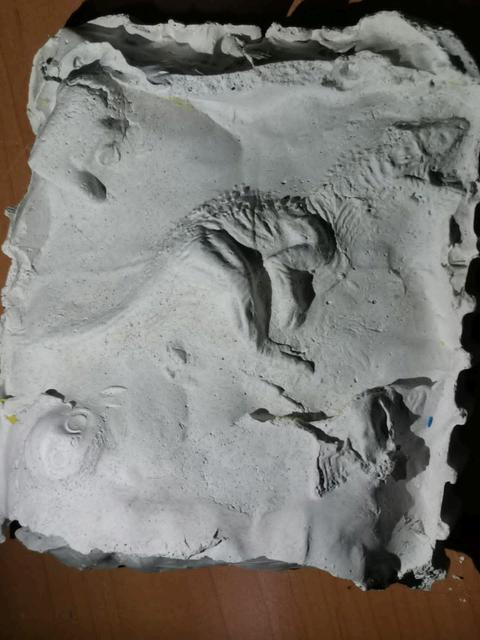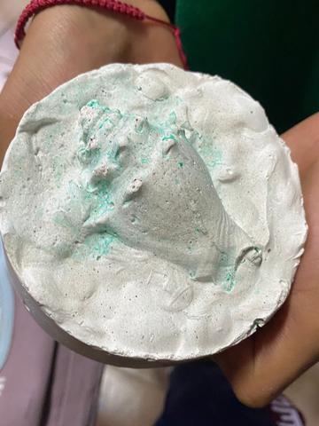 7. Se retira con cuidado de la mezcla ya seca, la plastilina y los excesos; se obtiene ahora un fósil de yeso con los detalles del objeto original.