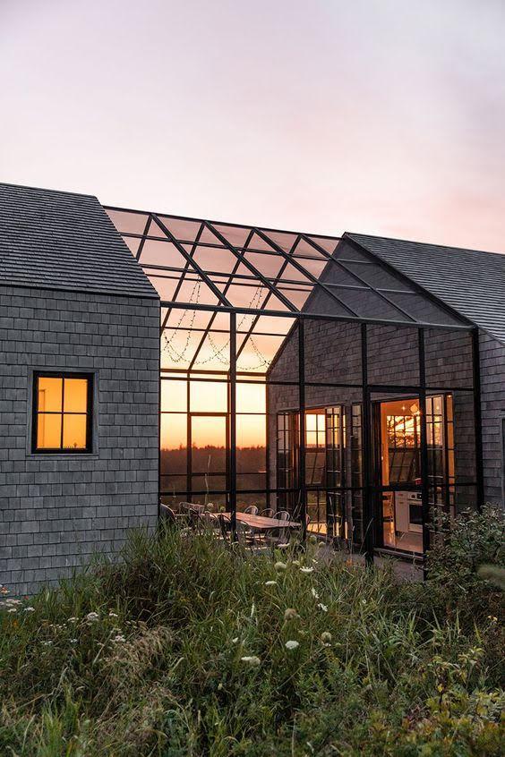 Pevný materiál v černé barvě použitý jako konstrukce zimní zahrady a zastrešení terasy.