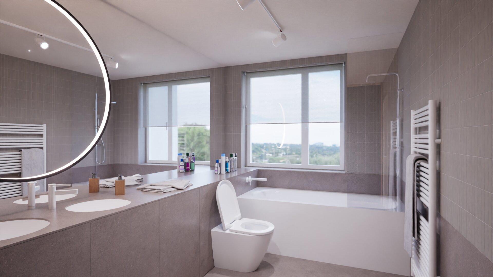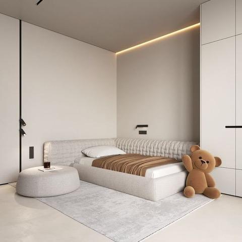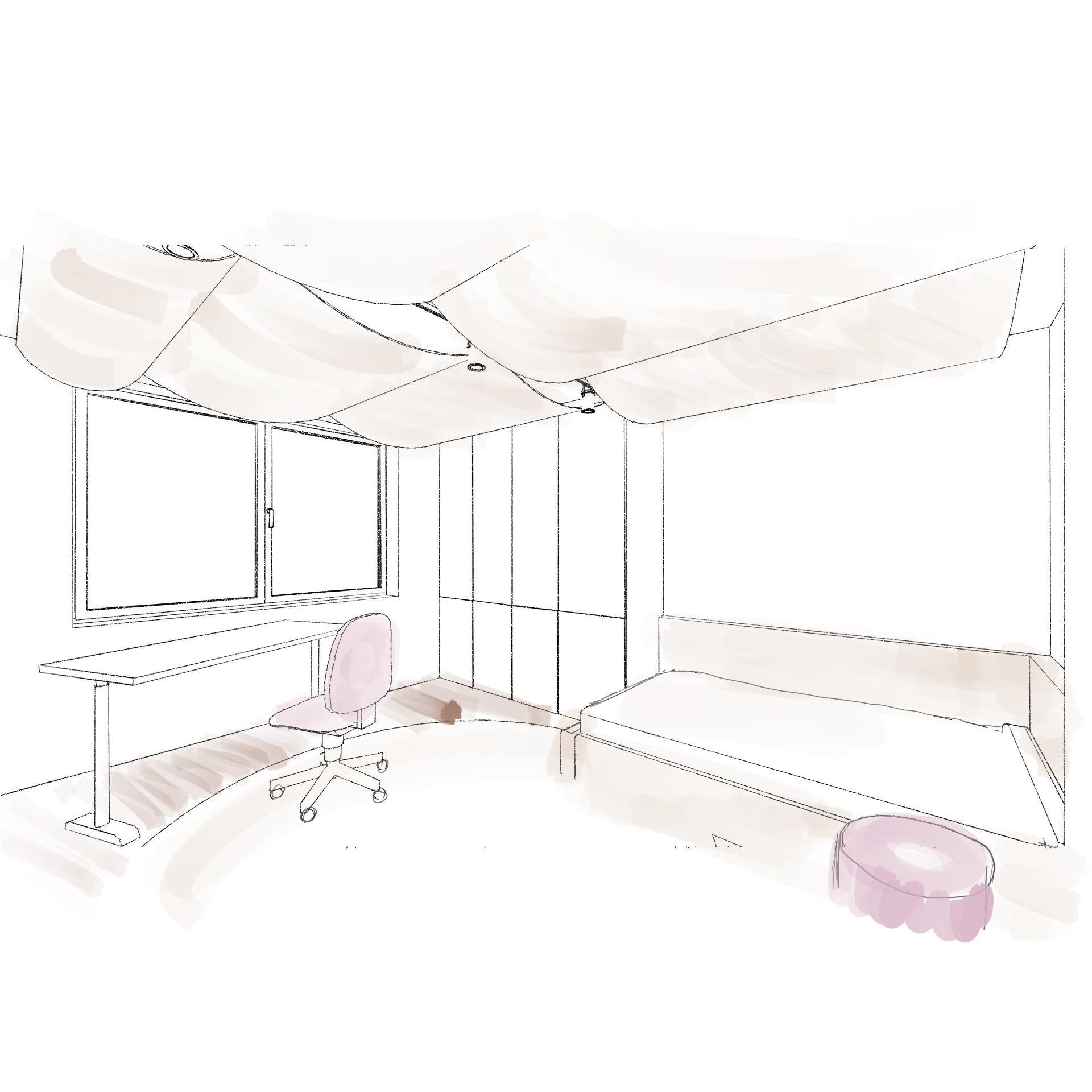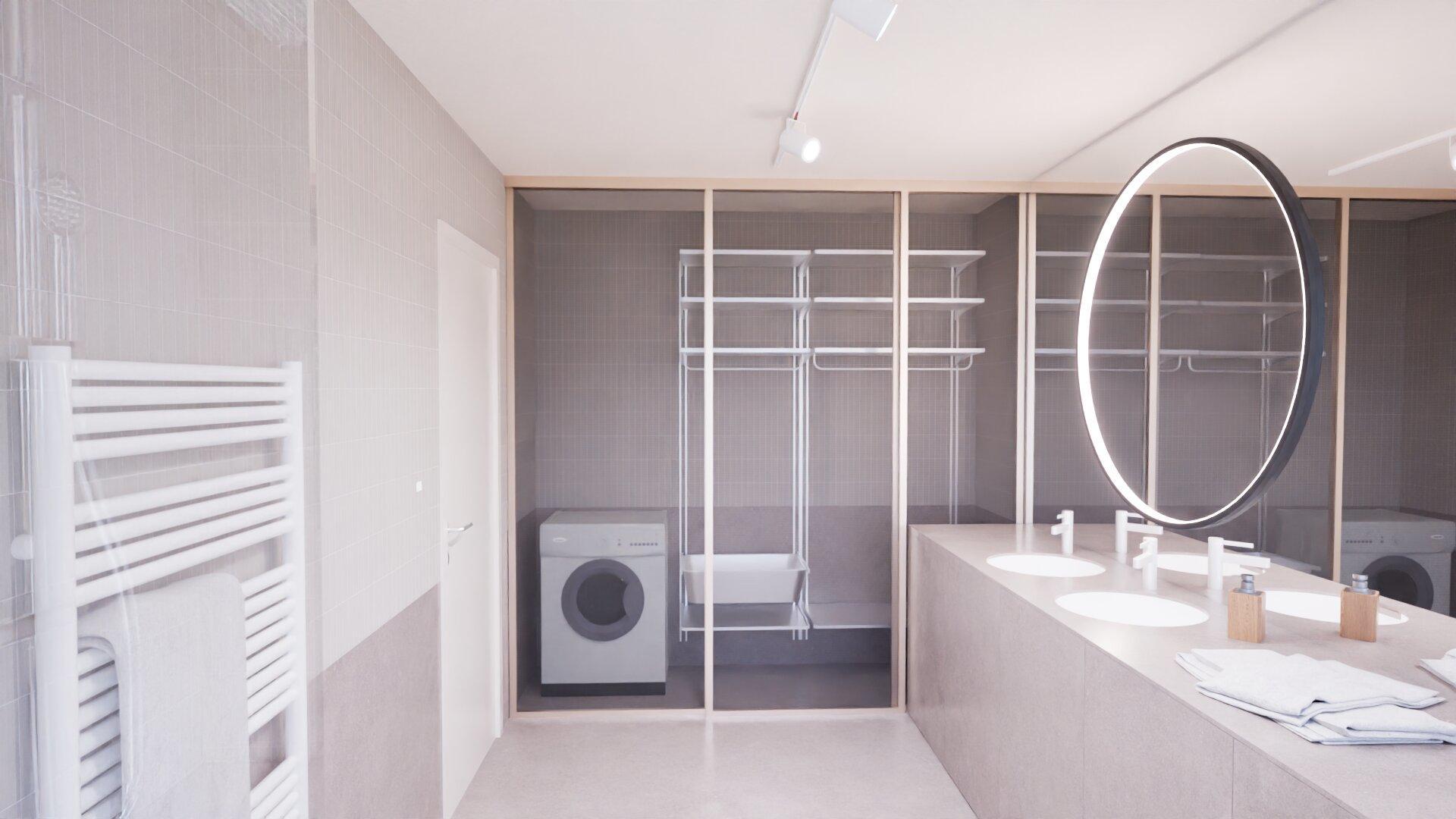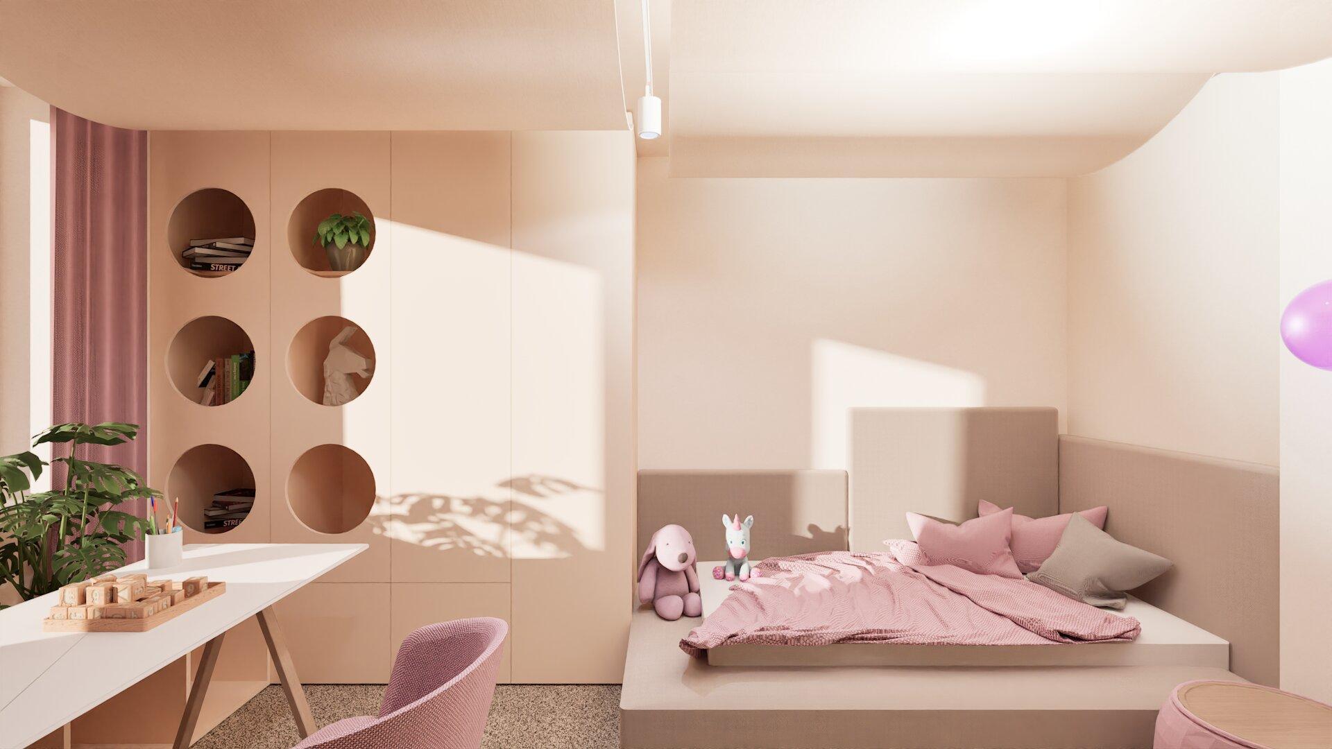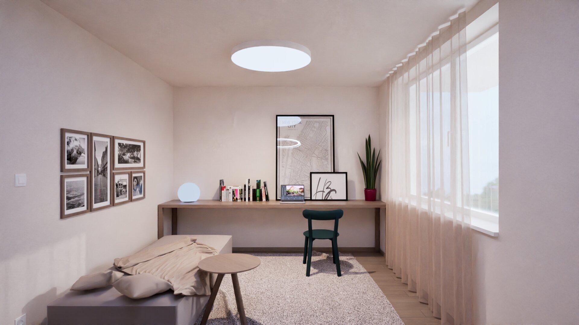 Na poschodí navrhneme interiér spoločnej kúpeľňe s vaňou a miestom na pračku so sušičkou, spálňu s dostatkom úložného priestoru, detskú izbu a pracovňu príložetostne fungujúcu ako hosťovská izba.