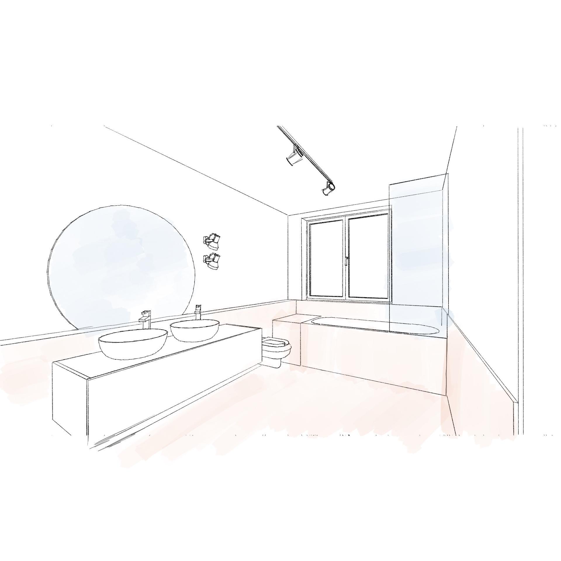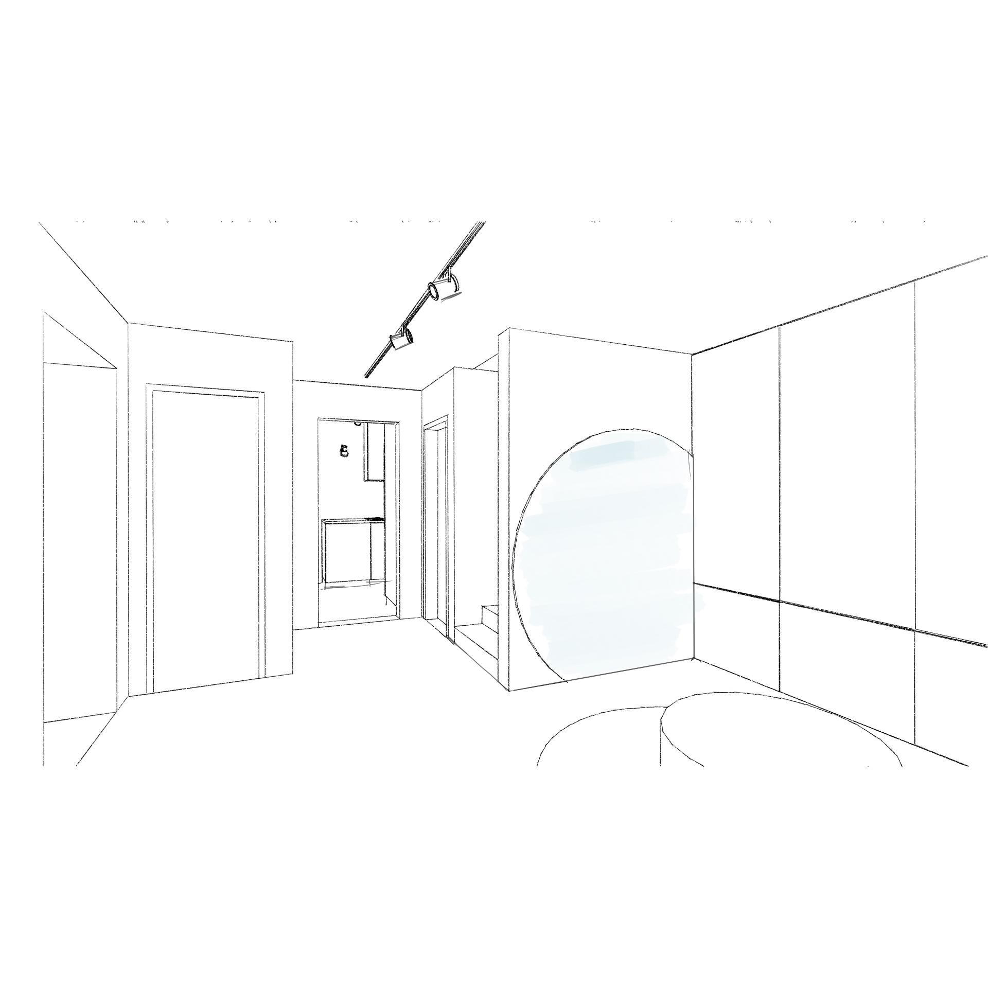 Hlavnou myšlienkou je kompozícia jednoduchých kolmých línií - podlahová krytina, lištové líniové svietidlá, nábytok. Ostré línie sú rozbité okrúhlymi detailmi - nové okno s výhľadom do záhrady, zrkadlá, svietidlá.