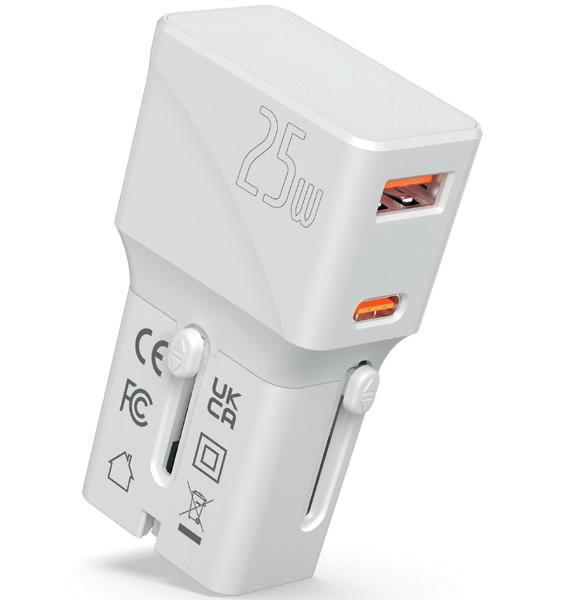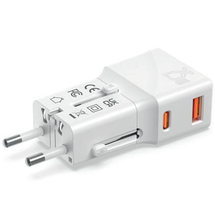 2-port USB pocket traveller charger, 1x Type C + 1x QC3.0 with maximum 25W for the power supply (smartphones, tablets) of several devices simultaneously. Suitable for travel to the EU/UK/US.