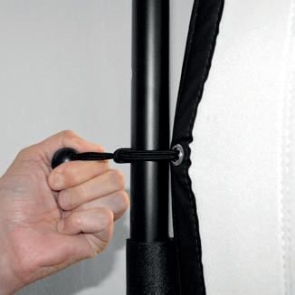 The screen is kept tought using a combination of easy to use bungee cords and Velcro straps.