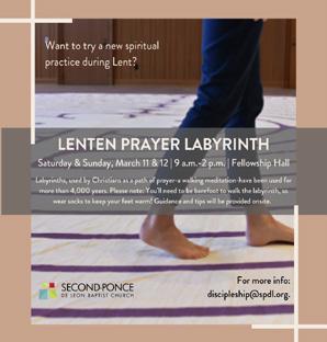 Interested in trying out a new spiritual practice during Lent? Then drop by the Fellowship Hall any time (or multiple times) between 9 a.m. and 2 p.m. Saturday, March 11 or Sunday, March 12. You will need to remove your shoes to walk the labyrinth ... so wear socks to keep your feet warm! Guidance and tips will be provided onsite. For more info, email discipleship@spdl.org.
