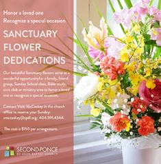 Our beautiful Sanctuary flowers serve as a wonderful opportunity for a family, friend group, Sunday School class, Bible study, civic club or ministry area to honor a loved one or recognize a special occasion. Contact Vicki McCaskey in the church office to reserve your Sunday: vmccaskey@spdl.org | 404.591.4344. The cost is $150 per arrangement.