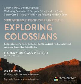 Join us for a delicious meal followed by part 2 of Exploring Colossians, led on alternating weeks by Rev. John Uldrick (9/13 & 9/27) and Dr. Dock Hollingsworth (9/20). On the menu for supper: Chicken pot pie, rice, salad, rolls & dessert. RSVP is required for the meal, so sign up by Noon, Monday, September 11 at www.spdl.org/rsvp.