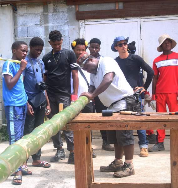 Babali expliquant aux élèves les découpes et assemblages du bambou
