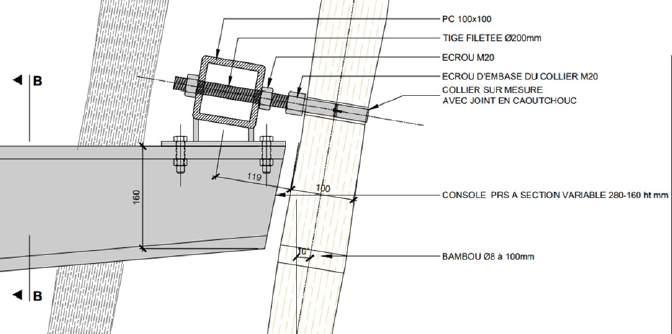 Coupe et détail du principe de fixation des bambous réalisés par C&E Ingénierie.
