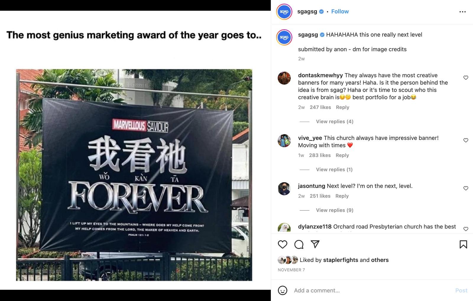 Along with its release in Singapore on 10th November 2022, the Orchard Road Presbyterian Church seized the opportunity to put up ‘Wo Kan Ta Forever’ publicity banners on its gate, with ‘Wo Kan Ta’ (‘I look to him’ in Mandarin) being a play on ‘Wakanda’.