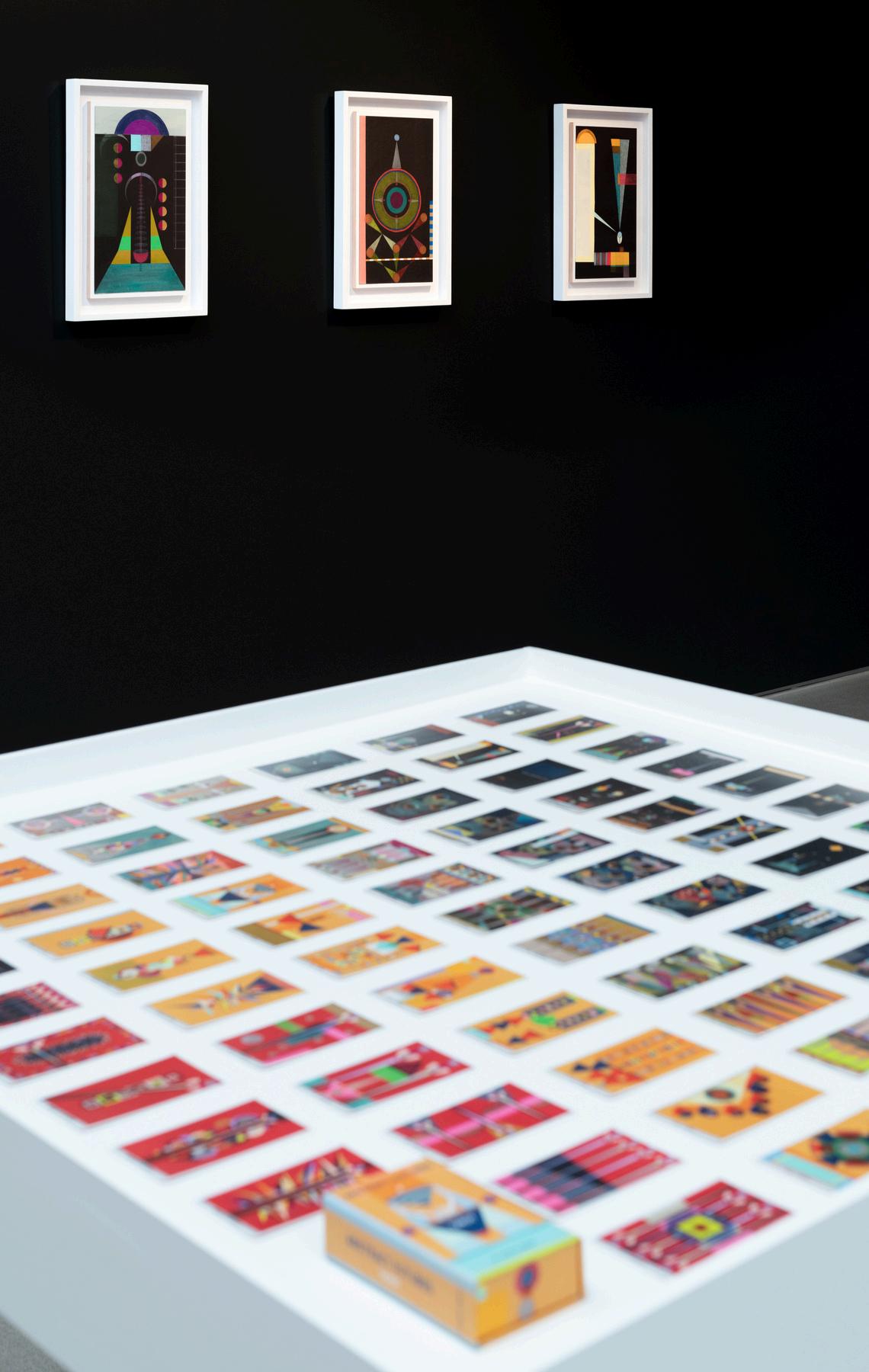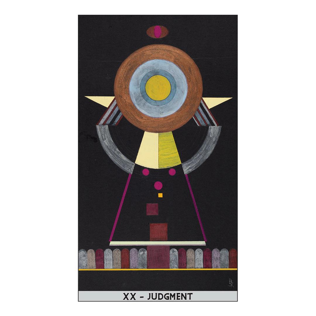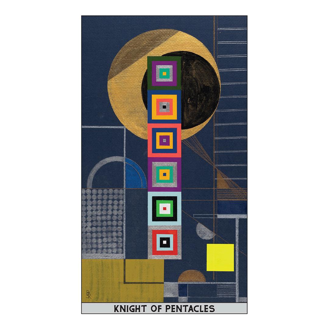 After curators Sharmistha Ray and Dannielle Tegeder selected work for the exhibition, the gallery engaged Sarah Potter, a professional witch, to do use tarot to guide the physical placement of the art in the gallery As was the case for placement in the first iteration of Cosmic Geometries (at the Elizabeth Foundation), arrangement the artwork in Cosmic Geometries: The Prairie’s Edge, tarot cards were drawn at random from the ABSTRACT FUTURES Tarot Deck by Hilma’s Ghost (beginning with the twentytwo Major Arcana)- one assigned to each artist in alphabetical order. The art work in the exhibition was then hung in order of the cards - from The Fool (0) to The World (22) The remaining 4 artworks were drawn from the suite of Pentacles. Remarkably, or perhaps not remarkably, the final placement of the artworks were faithful to