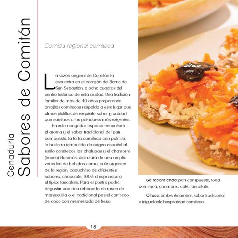 Se recomienda: pan compuesto, torta comiteca, chamorro, café, tascalate. Ofrece: ambiente familiar, sabor tradicional e inigualable hospitalidad comiteca.