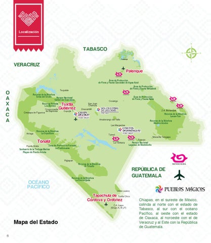 Chiapas, en el sureste de México, colinda al norte con el estado de Tabasco, al sur con el océano Pacífico, al oeste con el estado de Oaxaca, al noroeste con el de Veracruz y al Este con la República de Guatemala.
