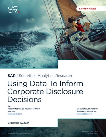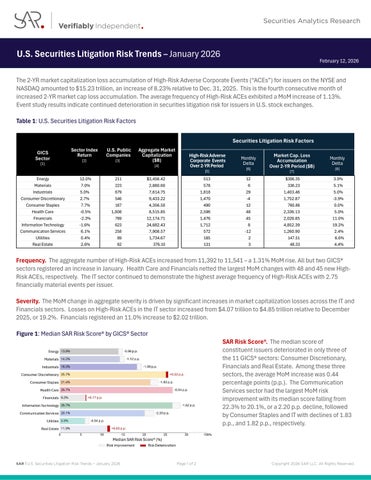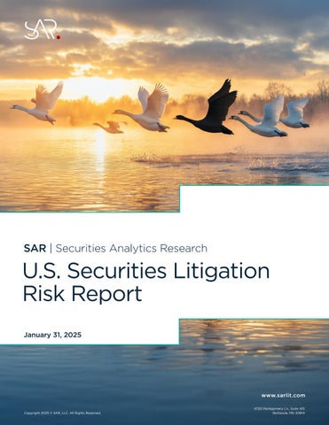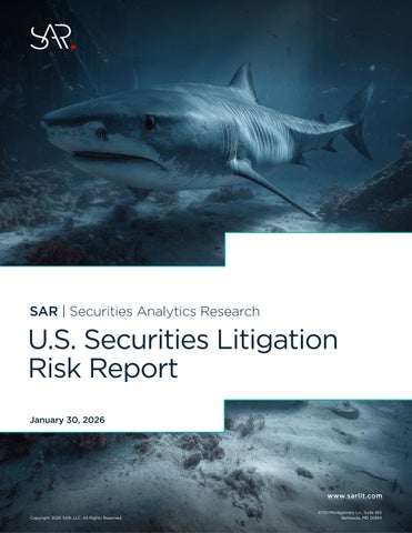 Securities Analytics Research (SAR): SAR LLC is a specialized data analytics company focused on securities litigation risk management analytics of U.S. public companies, founded in 2018 and based in Bethesda, MD. Through the SAR Platform®, users license verifiably independent and high-quality data analytics based on near real-time stock price performance in response to public companies’ corporate disclosures. SAR is the developer and publisher of the SAR Risk Score®, which is assigned to issuers that trade on the NYSE or NASDAQ at the close of trading. SAR applies the court-approved event study methodology to test stock price reaction on the universe of corporate disclosures to accurately estimate the probability and magnitude of securities litigation risk impacting directors and officers. SAR provides verifiably independent securities class action settlement valuations as evidentiary support in mediated negotiations that resolve securities claims that allege violations of the federal securities laws under the Exchange Act of 1934 and Securities Act of 1933. The company is committed to the verifiable independence and accuracy of the licensed data and has been publishing quarterly statistical back-testing results since 2018. SAR does not rely on artificial intelligence (AI) or machine learning (ML) and operates in accordance with documented standard operating procedures with assigned process owners to ensure independent, human accountability. The company does not engage in economic consulting, nor places capital at risk on behalf of investors or insurers. SAR does not actively trade, hold, or intend to hold positions on the universe of equity issuances listed on the NYSE or NASDAQ, and whose principals and full-time professionals are restricted from actively trading.