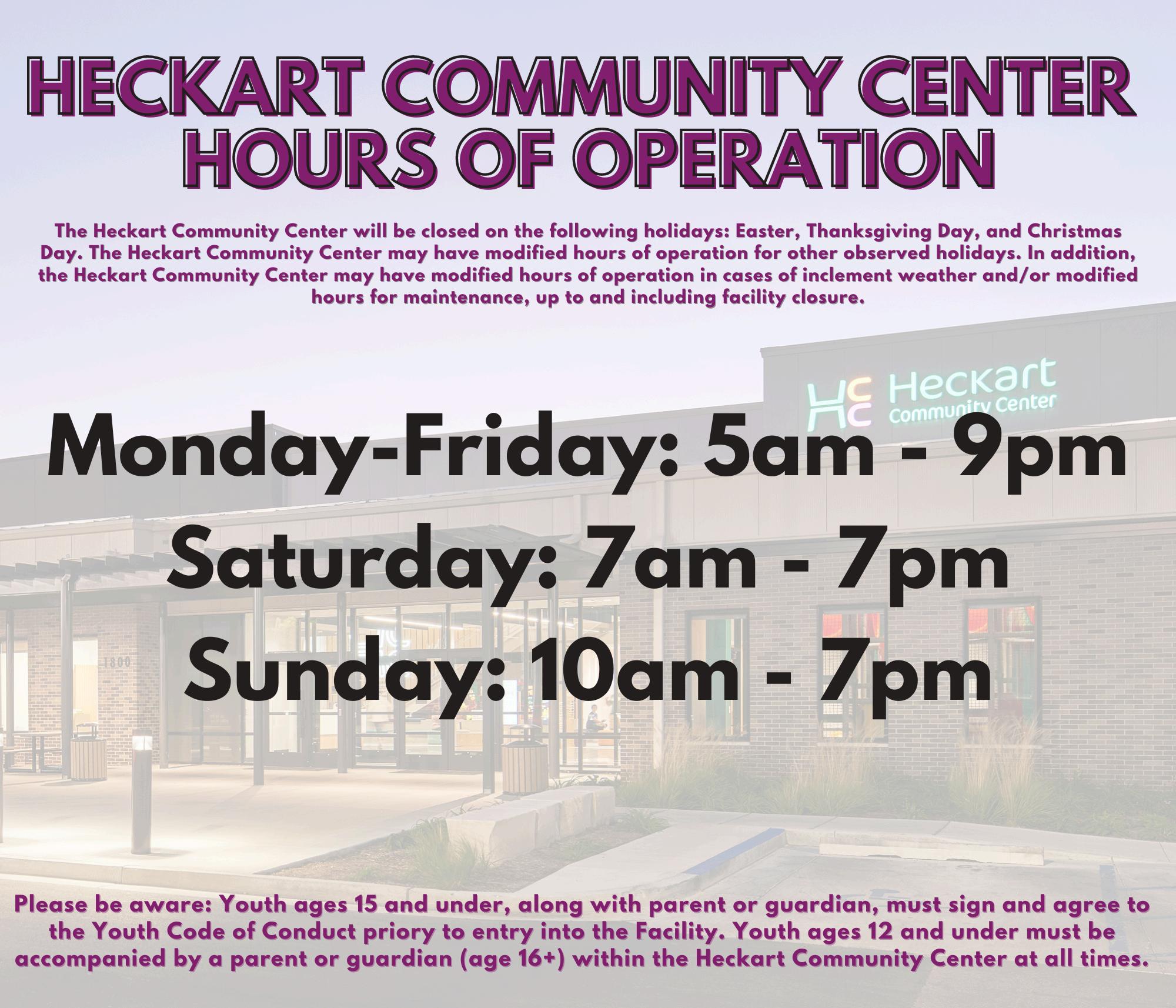 Youth ages 13 and older are allowed entry into the Heckart Community Center without adult supervision. All children 15 and under entering the facility unaccompanied by an adult MUST have a photo on file, current address, phone number, and an HCC contract signed by the user and guardian on file before using the facility. Youth ages 15 and under, along with parent or guardian, must sign and agree to the Youth Code of Conduct prior to entry into the Facility