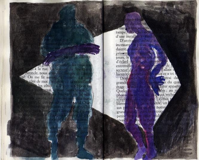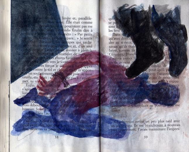 Le récit du livre est réactualisé par cette présence de l’image. Le livre peint est associé à un diptyque (2 dessins) montrant deux visages* émergents du papier, au contour en faible relief, obtenu par une série de piqures d’aiguille. Cette métaphore suggère la vulnérabilité des êtres mais aussi leur détermination.
