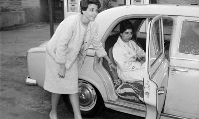 Djamila Boupacha (en voiture), accompagnée de son avocate Gisèle Halimi (à gauche) à sa sortie de la prison centrale de Rennes, le 21 avril 1962.