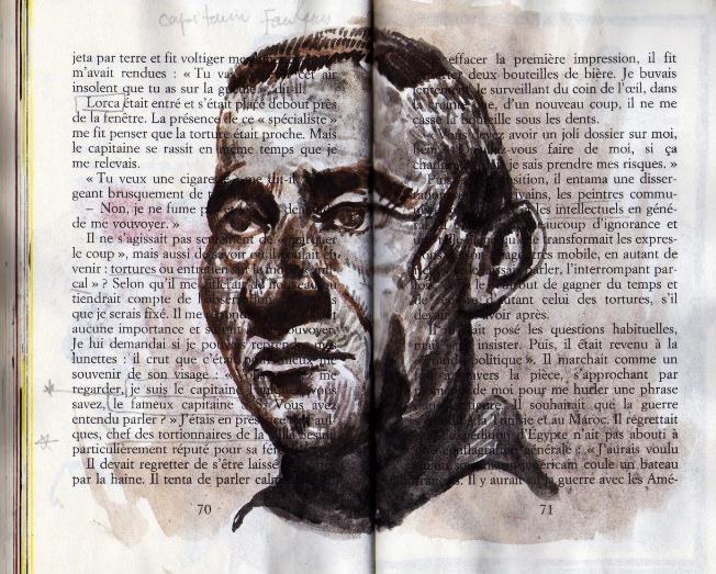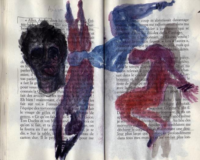 La réflexion sur l’histoire et la mémoire sont au cœur de la pratique de Mustapha Sedjal artiste contemporain. Il l’aborde par la vidéo, le dessin, les documents. Sa lecture de « la Question » l’a conduit à dessiner entre les pages de l’ouvrage d’Henri Alleg pour personnifier l’idée d’engagement.