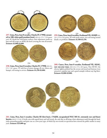 257. Lima, Peru, bust 8 escudos, Charles IV, 1799IJ, mount- 259. Lima, Peru, bust 8 escudos, Ferdinand VII, 1818JP. KMed in 18K white-gold pendant-bezel. KM-101; CT-17. 33.0 grams total. AU details but with grainy surfaces, faint adjustment marks on
