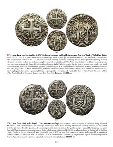 650. Lima, Peru, cob 8 reales Royal, 1729N, very rare, ex-Boyd. S-L21; KM-R34a; CT-616. 26.56 grams. A lovely coin, richly old-toned XF with NO HOLE (very rare thus), just some light old tooling in waves, minor doubling at top of cross, still very attractive and the kind of coin that gets passed down for generations from one important collector to another, this specific example purchased by the current consignor from a 1975 auction that anonymously featured choice cobs from the collection of F.C.C. Boyd, a huge collector in the first half of the 20th century. Similar to, but not a die-match with, Lázaro #23, rated at “RX” (no more than 3 specimens known), and comparable to a specimen that sold for $19,550 in the New York Sale (Baldwin / M & M) of December 2000 (lot #52). Pedigreed to the Superior auction of August 1975 (F.C.C. Boyd collection), with original lot-tag #2026, plated in the catalog. Estimate: $10,000-up. 177