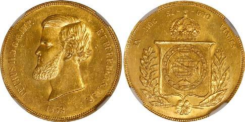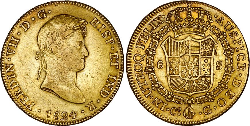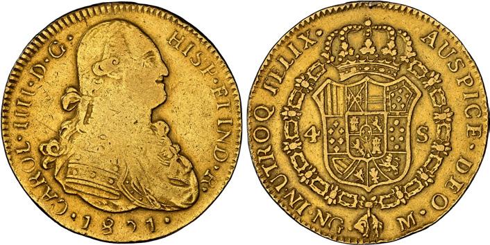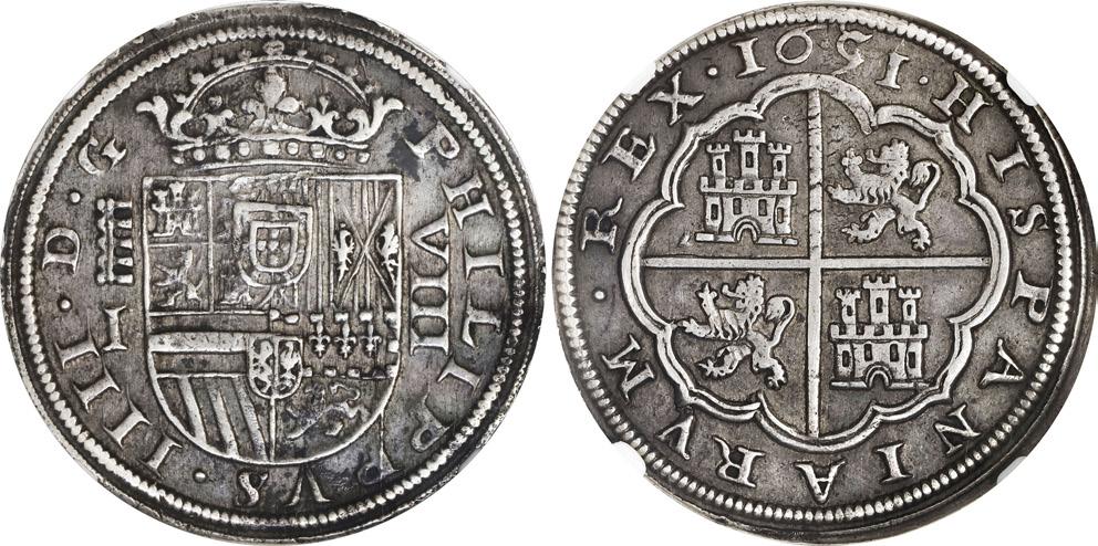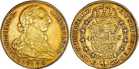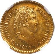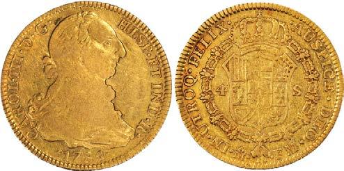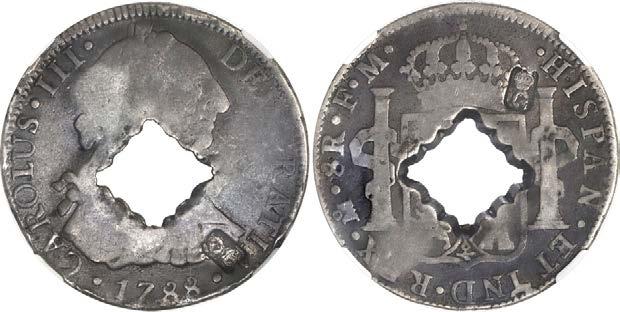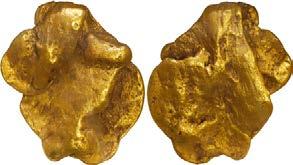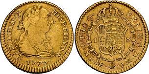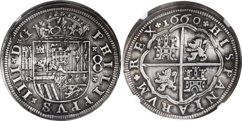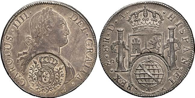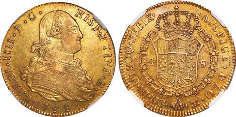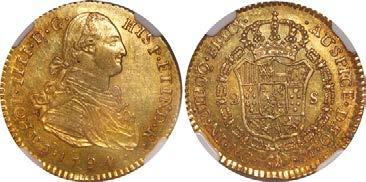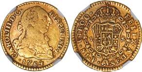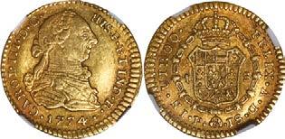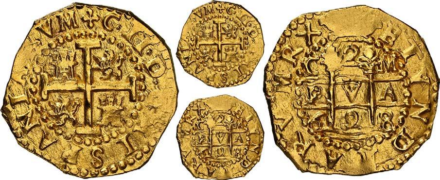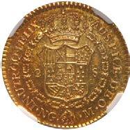 9. SPA , Se ille, gold cob 8 escudos, Charles , 1680 74 S, uni ue (unlisted), C A 50, finest and only example in NGC census. Cal-unl (Type 181); KM-unl (168.2 for type); Fr-217. 26.75 grams. Very odd (large) shape with arcuate edge and hairline split, most of shield and cross (bold) with red toning in crevices, bold S•S to left, but most important feature is the full and clear date with blatant overdate that is unlisted and currently unique (1680/78 known as well). NGC #8300062-004. Estimate: $10,000-up.